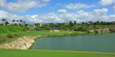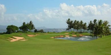 Located west of Pearl Harbor in sunny Kapolei, the par-72 championship layout is beautifully landscaped with floral gardens, thousands of coconut palms and five expansive lakes. Architect Ted Robinson, who is known for his creative use of water, moved massive amounts of dirt to create the lakes and to provide elevation and contouring for the course. The beautiful lakes come into play on 12 holes and in addition to being aesthetically pleasing, serve an important environmental function, catching storm run-off from the surrounding terrain.